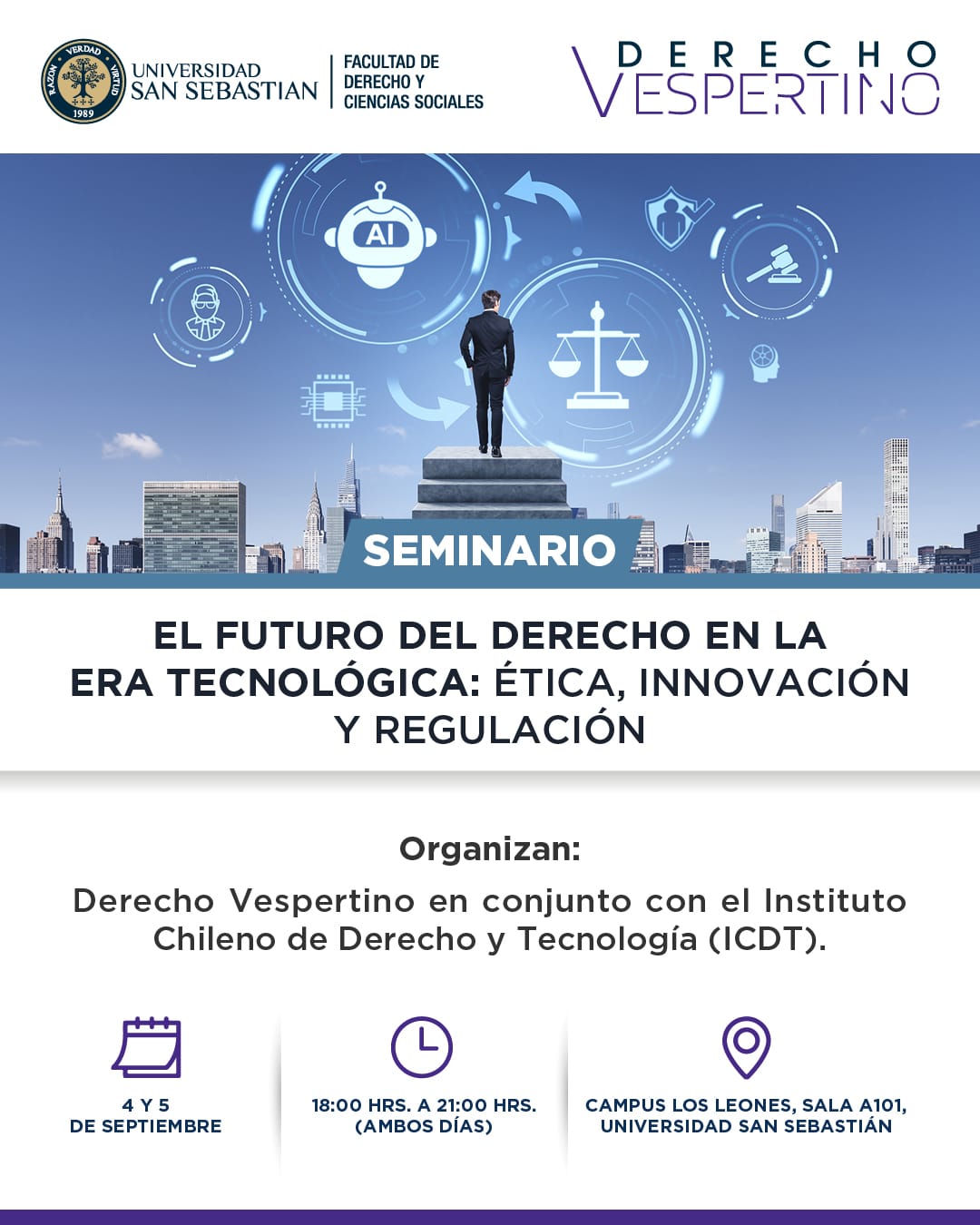 Como actividad preparatoria del Seminario Internacional #MisDatosSoyyo Chile 2025, los días jueves 4 y viernes 5 de septiembre de 2025, de 18:00 a 21:00 horas, la carrera de Derecho Vespertino USS y el Instituto Chileno de Derecho y Tecnologías llevarán adelante, en forma gratuita y abierta a público, el Seminario "El futuro del Derecho en la era tecnológica: ética, innovación y regulación".
